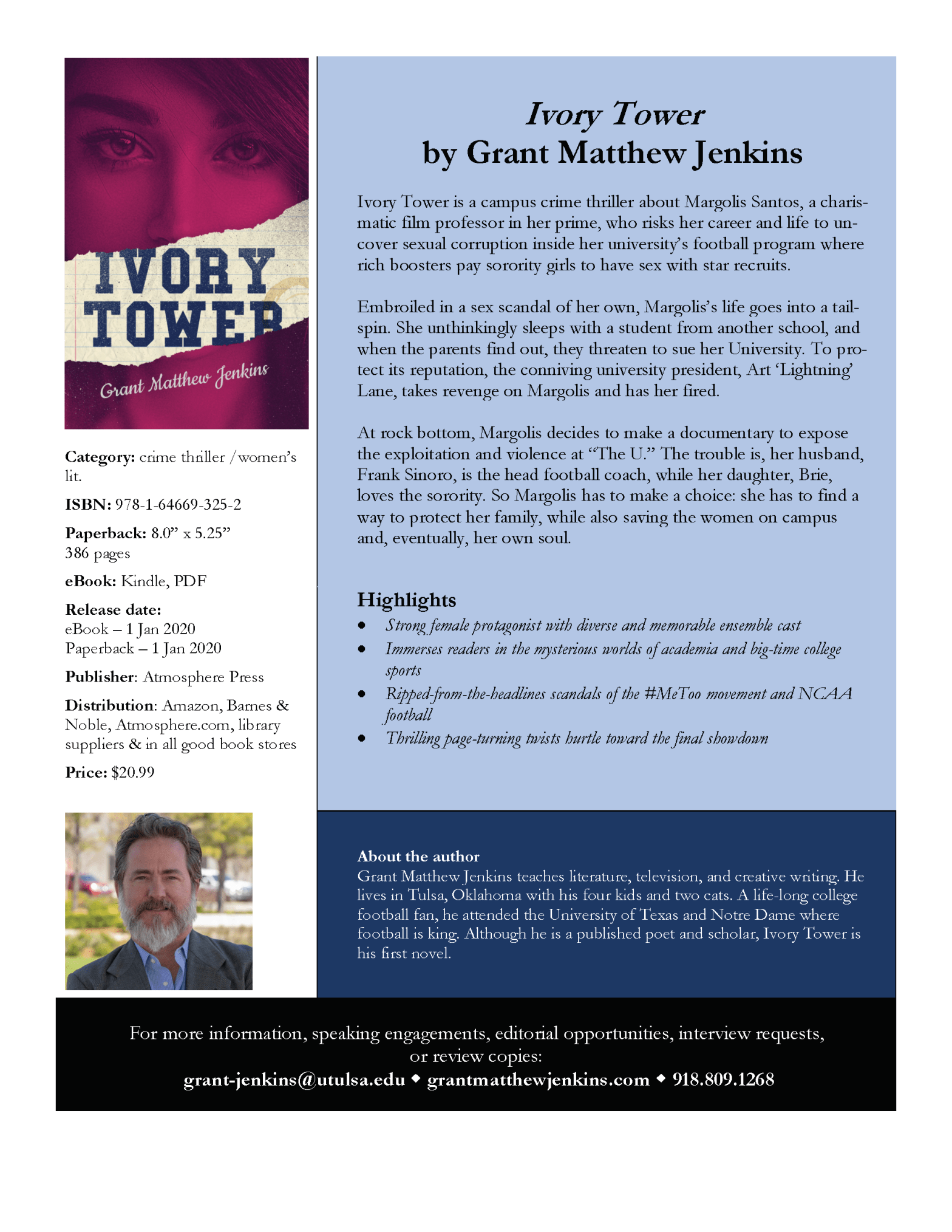 Ivory Tower is the new novel by Grant Matthew Jenkins in which intrepid film professor, Margolis Santos, rallies a ragtag band of women to take on a corrupt university football program that is paying sorority girls to sleep with start recruits.